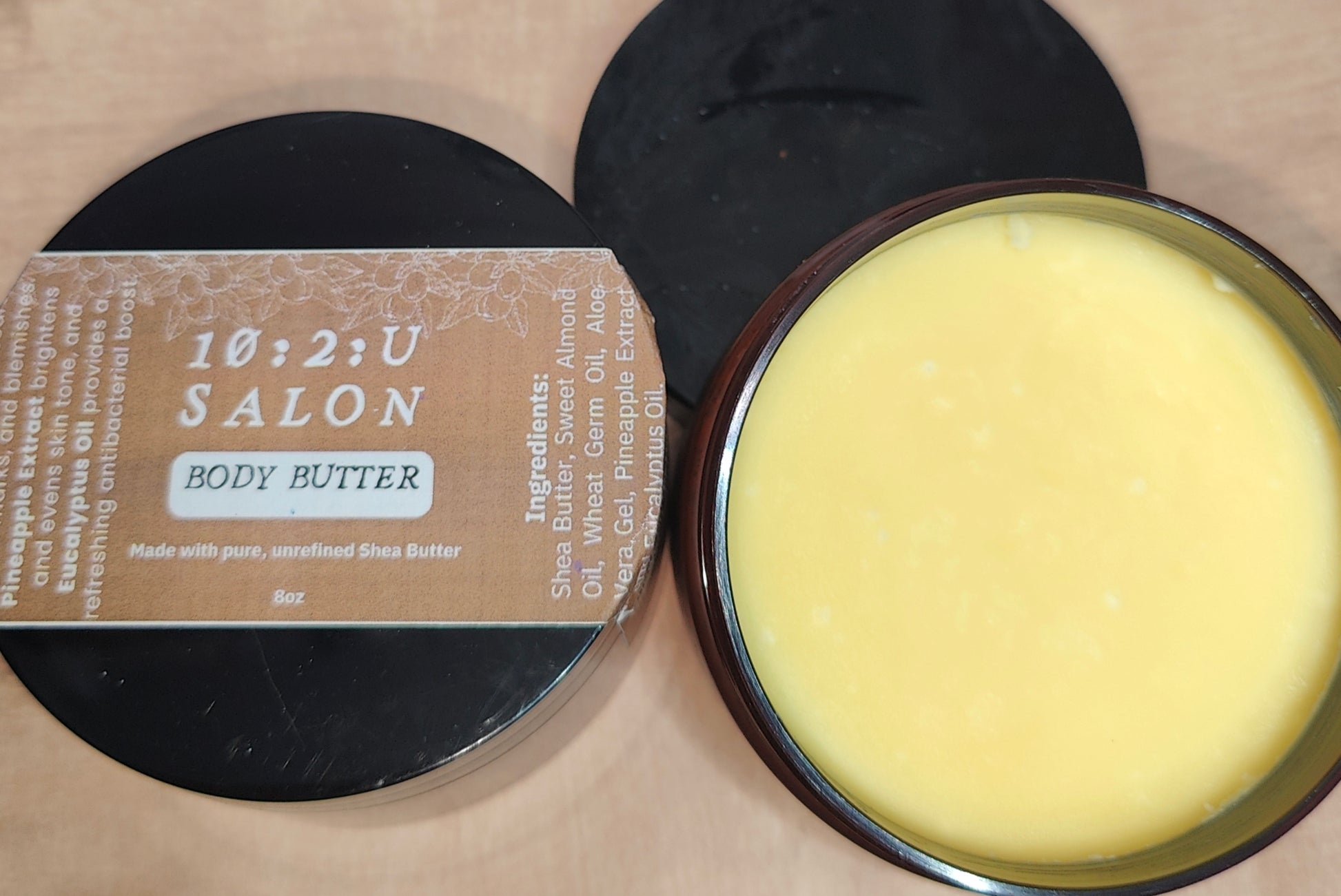 Escape to paradise with the 10:2:U Salon Body Butter, coined 'Island Girl' a rich yet breathable formula for tropical skin. A daily body butter that deeply nourishes without feeling greasy or clogging pores.